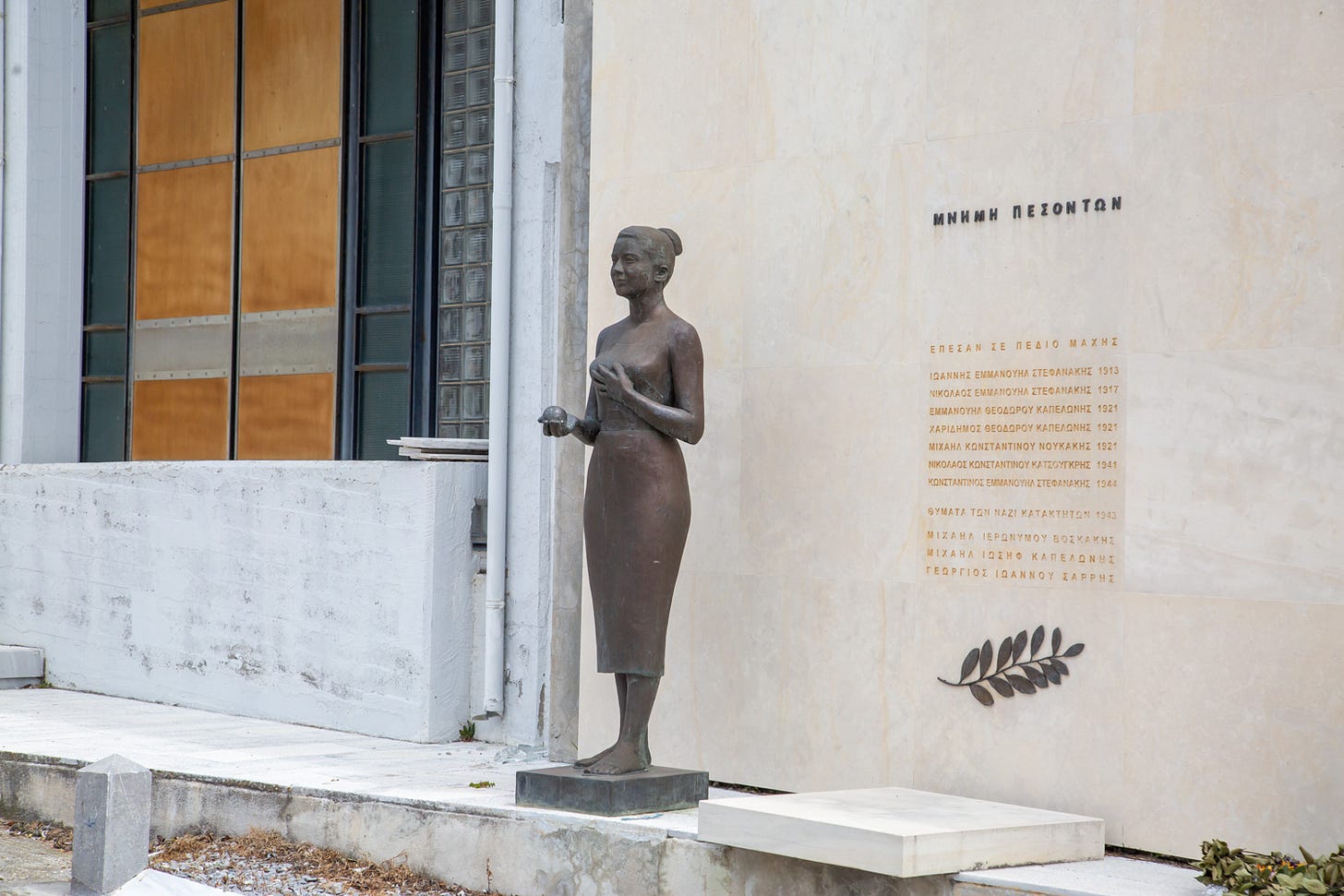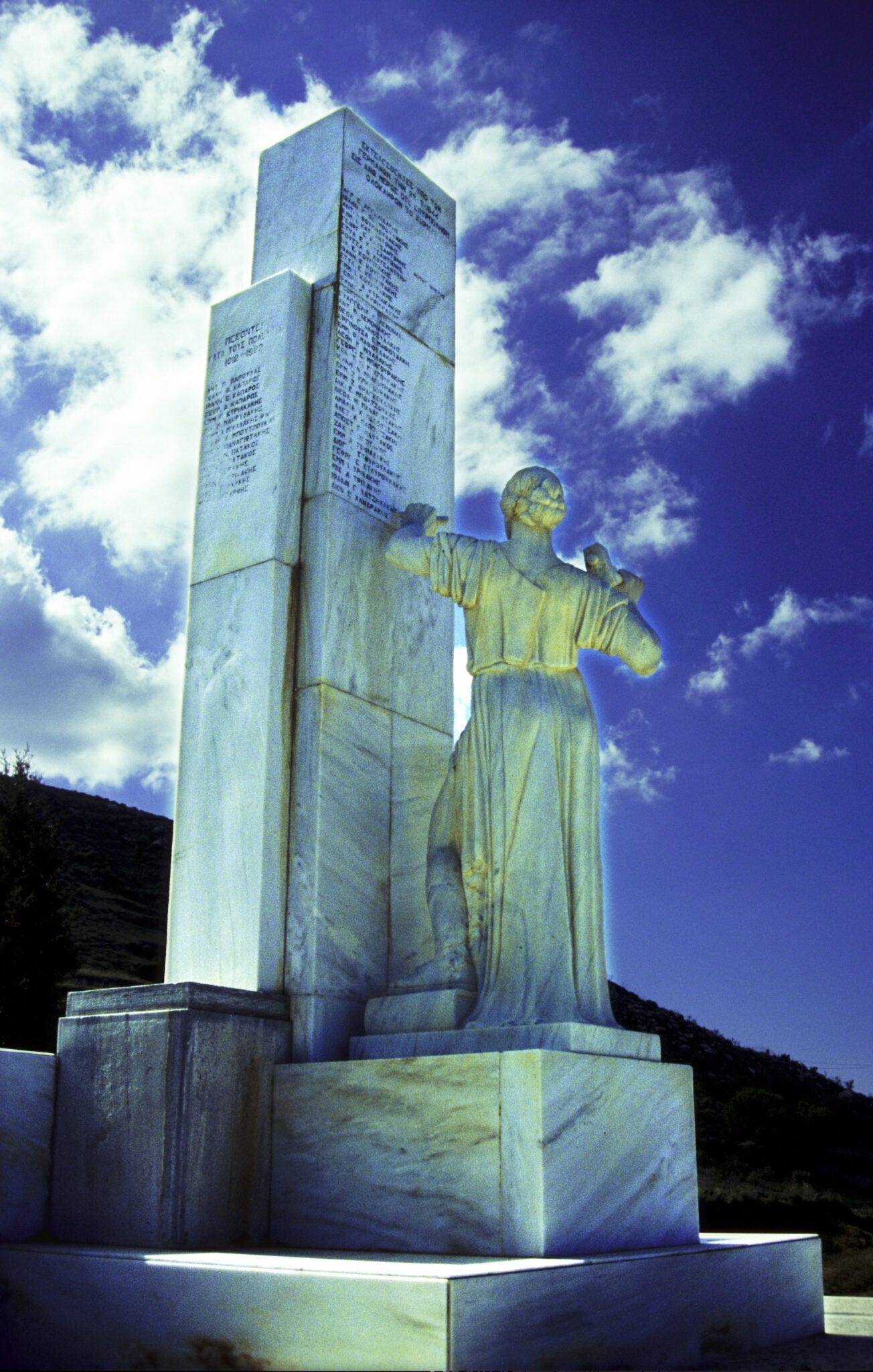 Fahren Sie zu den Dörfern von Kedros und nehmen Sie sich Zeit für das Denkmal in Ano Meros. Es steht nahe dem Nordeingang der Siedlung, umgeben von Kiefern und mit Blick über das Tal. Das Herzstück des Denkmals ist eine hohe Stele, auf der die Namen der Toten eingraviert sind. An ihrem Fuß erhebt eine überlebensgroße Frau in einem wallenden Kleid Hammer und Meißel, um diese Namen in Stein zu meißeln. Die Komposition ist einfach und erschütternd. Man spürt die Last der Erinnerung in der Bewegung ihres Arms und der Haltung ihrer Schultern. Dies ist eines der eindrucksvollsten Denkmäler in Amari. Es fasst die Geschichte von Kedros in einem einzigen Bild zusammen und hält es dort im Wind.