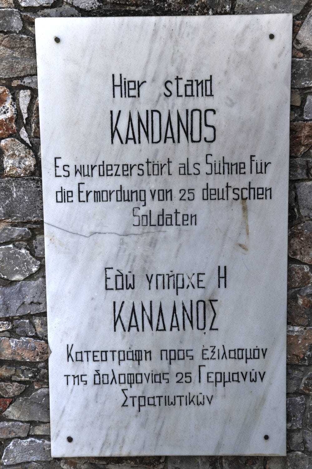Darin heißt es, Kandanos sei durch die Ermordung von 25 Nazi-Soldaten zerstört worden. Jeder Einwohner von Kandanos wurde ermordet, darunter etwa 180 Männer, Frauen und Kinder. Ihr altes Dorf wurde vollständig zerstört.