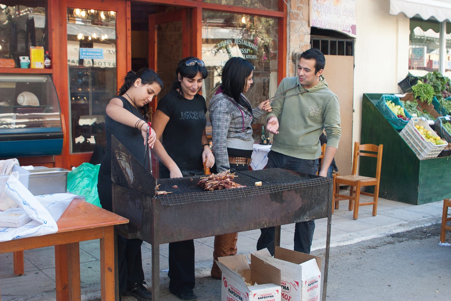 Es zeigt, wie Kreta Altes und Neues zugleich vereint. Eine moderne Stadtstraße mit Autos und Leuchtreklamen verwandelt sich auf Tsiknopempti in etwas, das vor einem Jahrhundert hätte existieren können: ein Feuer, ein Beisammensein, Menschen, die sich gegenseitig füttern.