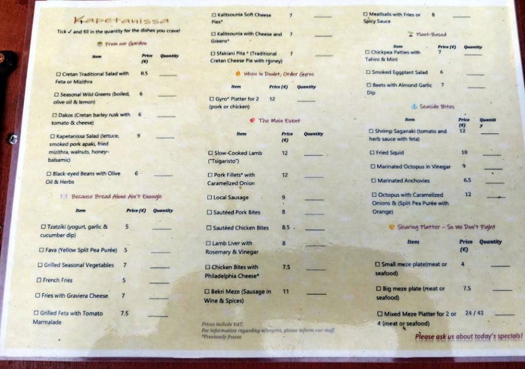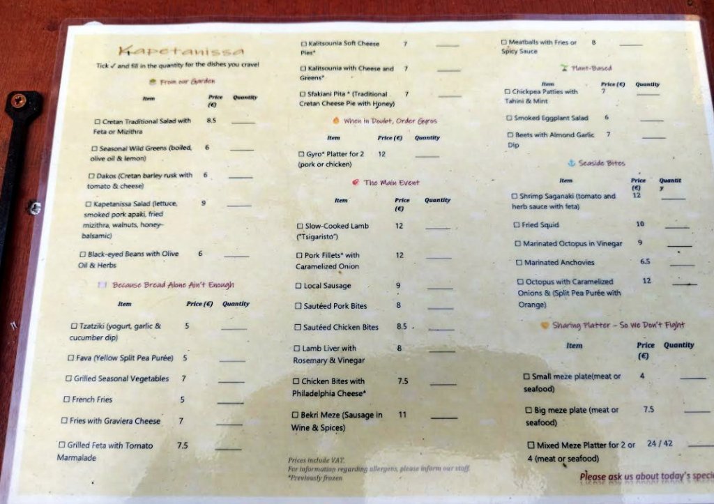 Neu: Das „Kapetanissa“ in Paleochora. Veröffentlicht am 18. November 2025 von Jörg Typisch griechisch. Mitten im Ort. Im ehemaligen „Roxanni“. Geöffnet ab morgens um 10:00 Uhr. Typisch griechische Gerichte und auch Amstel vom Fass. Im Innenhof wird noch gebaut. Hier gibt sich Joanna für ihre Gäste alle Mühe. Das Kapetanissa ist täglich ab 11:00 geöffnet. Montag ist Ruhetag. Natürlich auch zu empfehlen. Das gleichnamige „Kapetanissa“ in Kandanos. Beitrags-Navigation « Nationalfeiertage auf Kreta – der 17. November.Kreta: Apokoronas. »