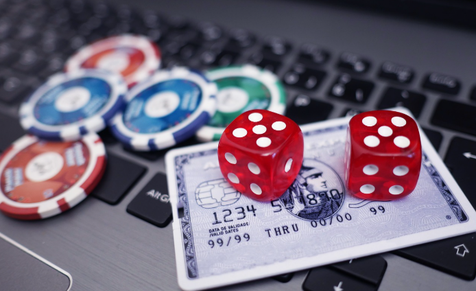 ALT: Rote Würfel und Casino-Chips auf einer Kreditkarte, die auf einem Laptop-Tastatur liegen